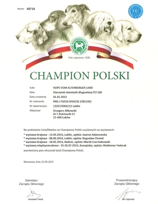 HOPE, mimo iż jest jeszcze bardzo młodą suką już może poszczycić się wieloma sukcesami na wystawach krajowych, czego przykładem są zdobyte liczne trofea w postaci pucharów i medali. Bez wątpienia jej (i moim) największym sukcesem jest Champion'at Polski z 2015 roku.